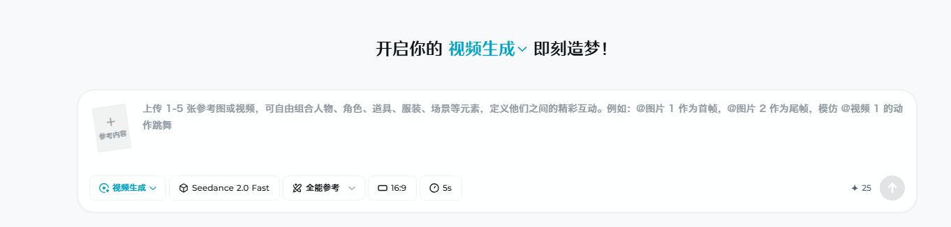 - 全能参考模式:Seedance2.0 的核心模式,功能拉满,熟练后建议优先使用,可实现 90% 以上的创作想法,精准落地各类复杂需求。