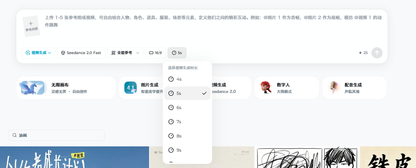 - 视频时长:首次使用建议选择 4-6 秒,生成速度快(约 1 分钟出结果),便于快速调整优化;熟悉操作后,可延长至 10-15 秒,目前 Seedance2.0 单次生成最长支持 15 秒,网上流传的“单次生成几十秒”,均为后期拼接而成;